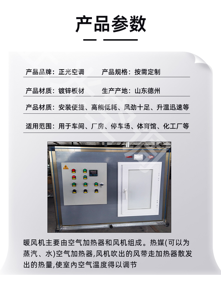 本產品是通過電加熱水,水通過循環泵,循環到表冷器,由低噪聲高風壓離心風機把熱量散發出去,射程達到30米,使室內的風迅速循環,從而達到升溫效果!