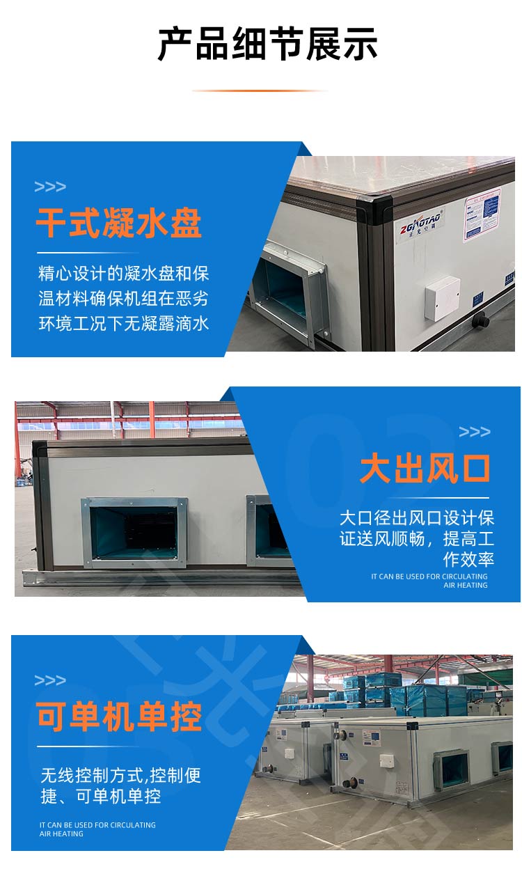 空調(diào)機組是由各種空氣處理功能段組裝而成的一種空氣處理設備。適用于阻力大于100Pa的空調(diào)系統(tǒng)。機組空氣處理功能段有:空氣混合、均流、過濾、冷卻、一次和二次加熱、去濕、加濕、送風機、回風機、噴水、消聲、熱回收等單元體。麗風JK系列組合式潔凈空調(diào)機組風量從3500m3/h至200000m3/h計30種規(guī)格共12種功能段供用戶自由選擇組合。主要適用于各種潔凈廠房的空氣凈化系統(tǒng)。如工業(yè)電子廠、精密機械制造廠、紡織車間、GMP制藥廠、化妝品、食品廠、純水車間、醫(yī)院手術(shù)部、ICU等多種場合。